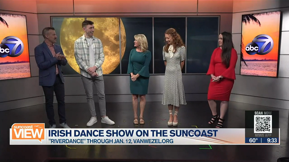 The performers of Riverdance teach some steps to the hosts of Suncoast View.